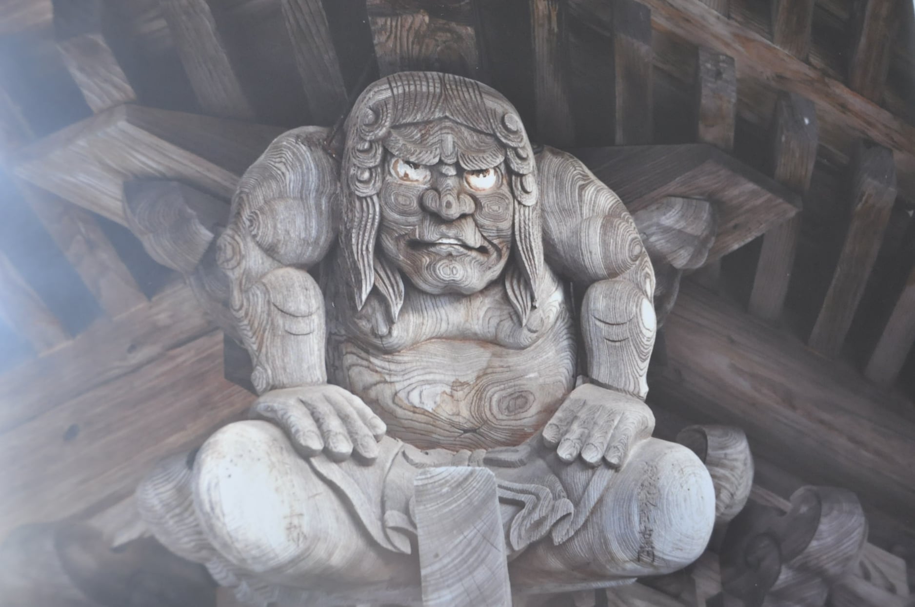 延享元年(1744)建立。祭神は山を司る大山祇神(おおやまずみのかみ)。これは、平良地区には山仕事をする人が多かったためと言われています。 神社を支える支柱には、それぞれ違う表情の力士像が鎮座。地元では四隅をしめくくるという意味で、「隅っこ背負い(すまっこしょい)」と呼ばれています。