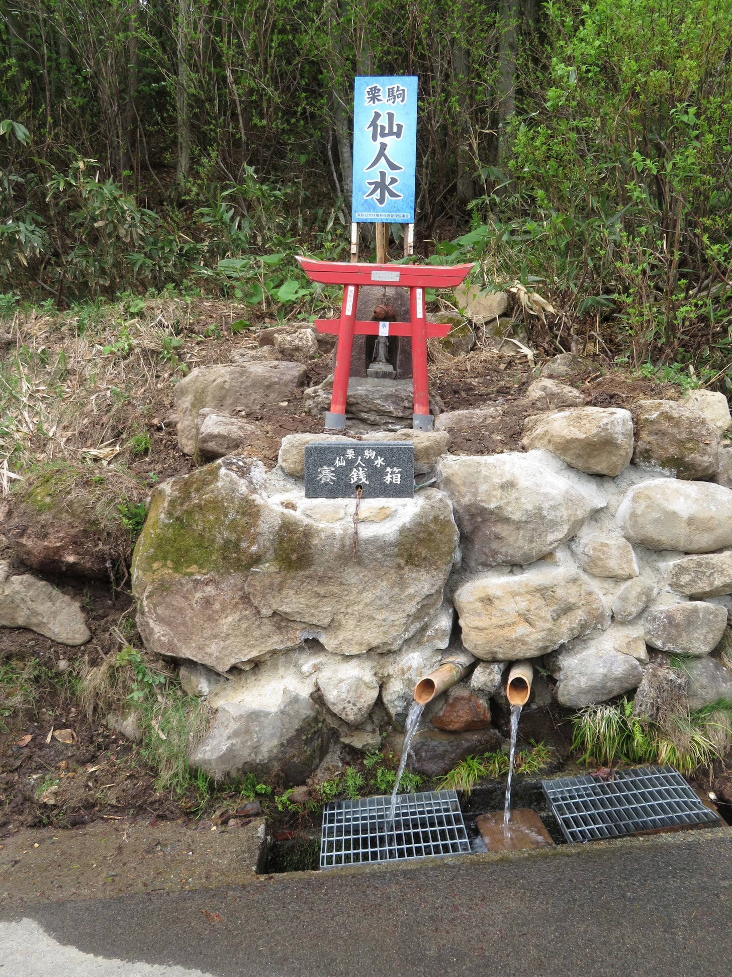 「栗駒山」の麓標高約900㍍の高所にある湧き水スポットです。 栗駒山麓から染み出す豊かな清水が旅の疲れを癒します。 栗駒山荘の眼下、国道342号線沿い。小さな赤い鳥居が目印です。 水質も良く、くせのないおいしい水です。お茶にも適し、ポリタンクなどに持ち帰りも可能です。