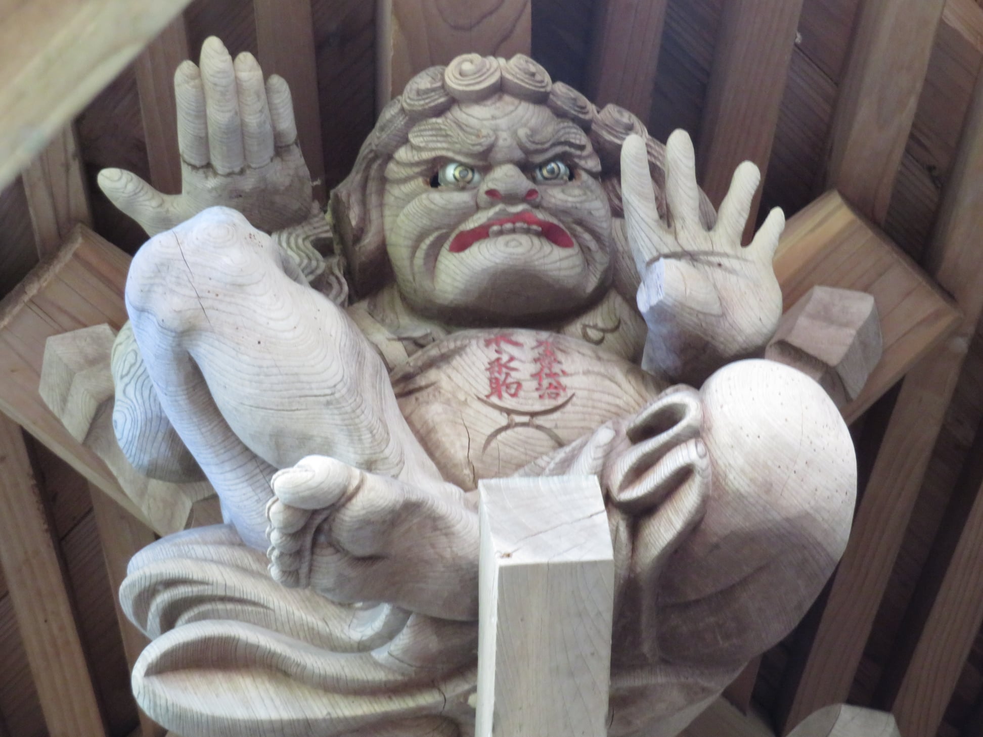 神社を支える支柱には、それぞれ違う表情の力士像が鎮座。地元では四隅をしめくくるという意味で、「隅っこ背負い(すまっこしょい)」と呼ばれています。